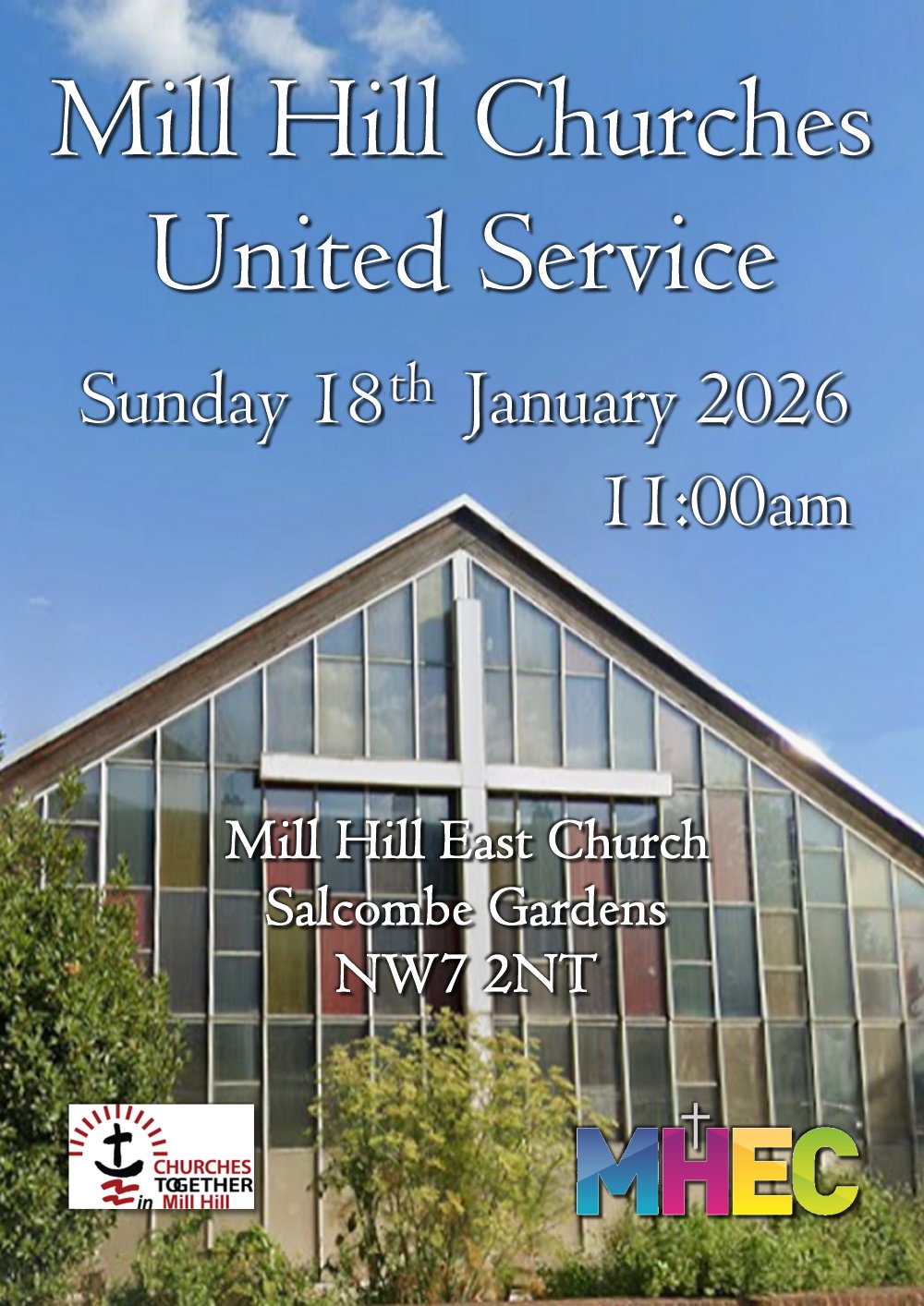 Churches Together in Mill Hill will be holding a united service at Mill Hill East Church, Salcombe Gardens NW7 2NT on Sunday 18th January at 11:00am.